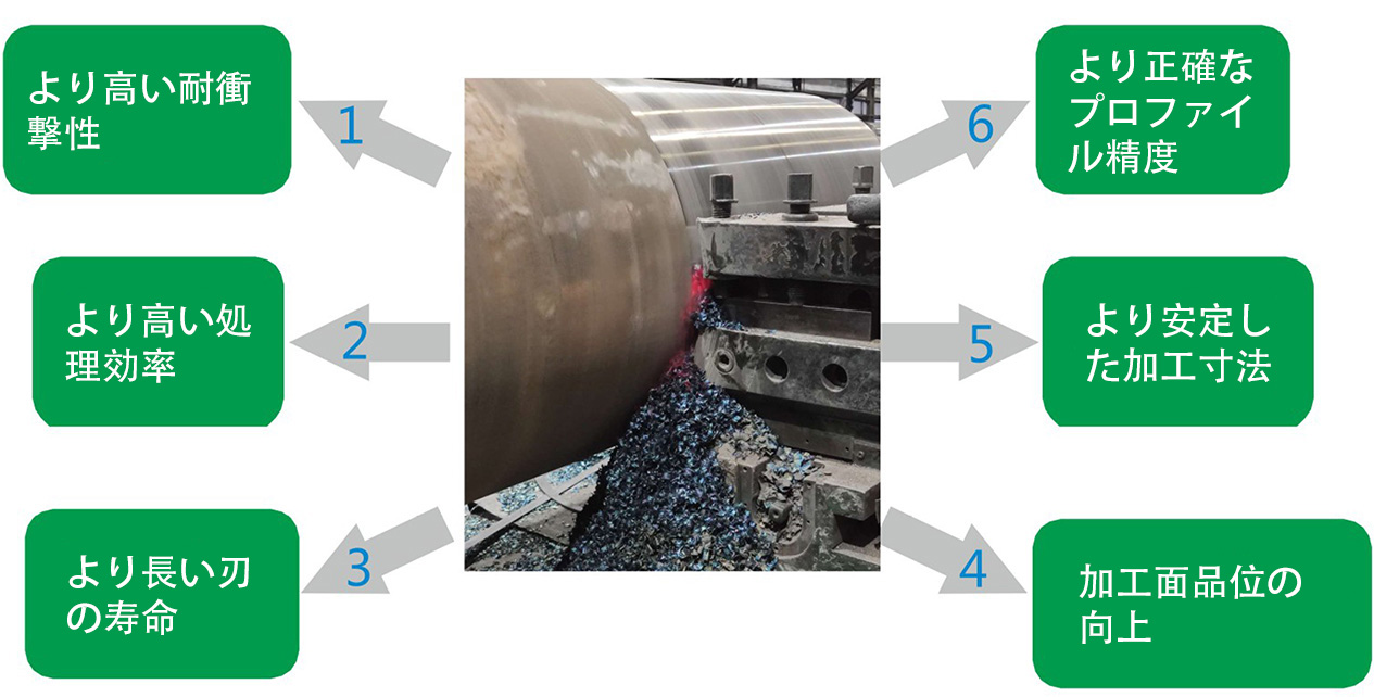 | ワーク名:ロール 被削材: ハイカーボン半鋼、硬度 HSD 72 選択したインサート: ZBN6500 SNGN150720 切断パラメータ: ap=8mm、F=0.6-0.8mm/r |